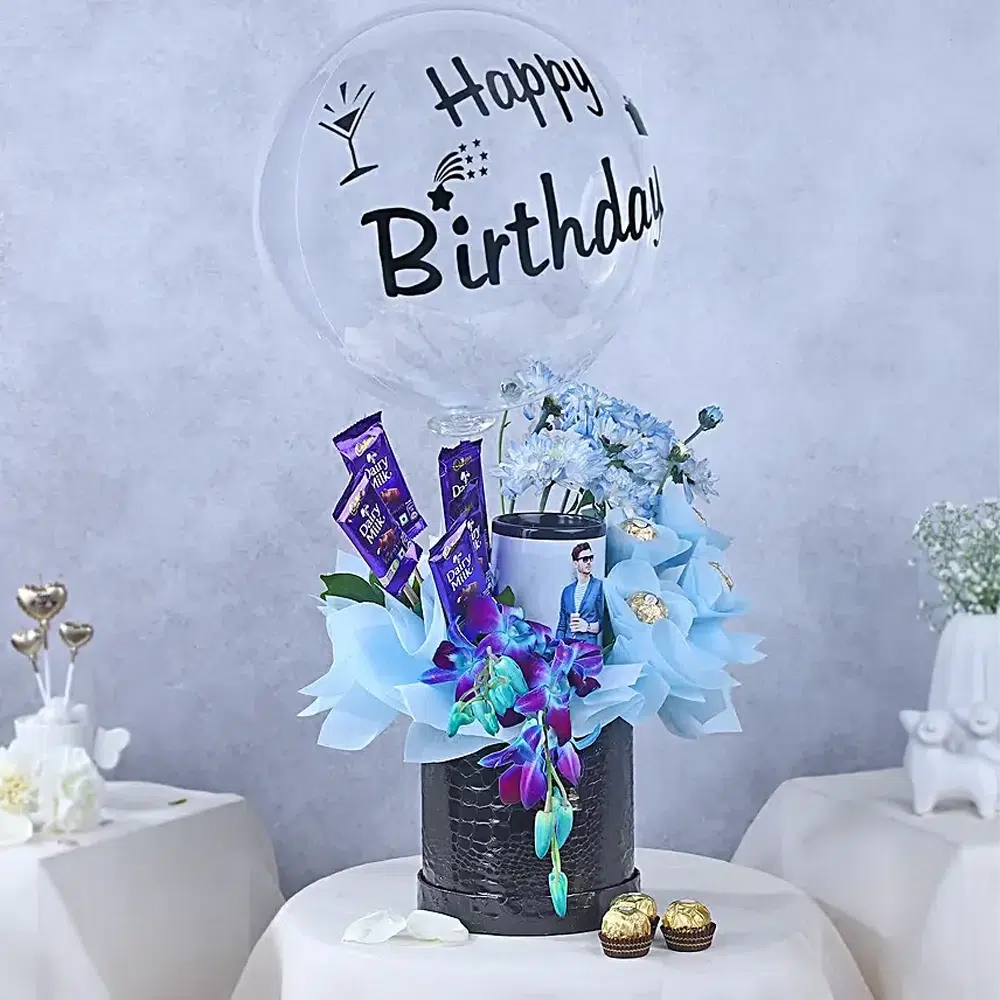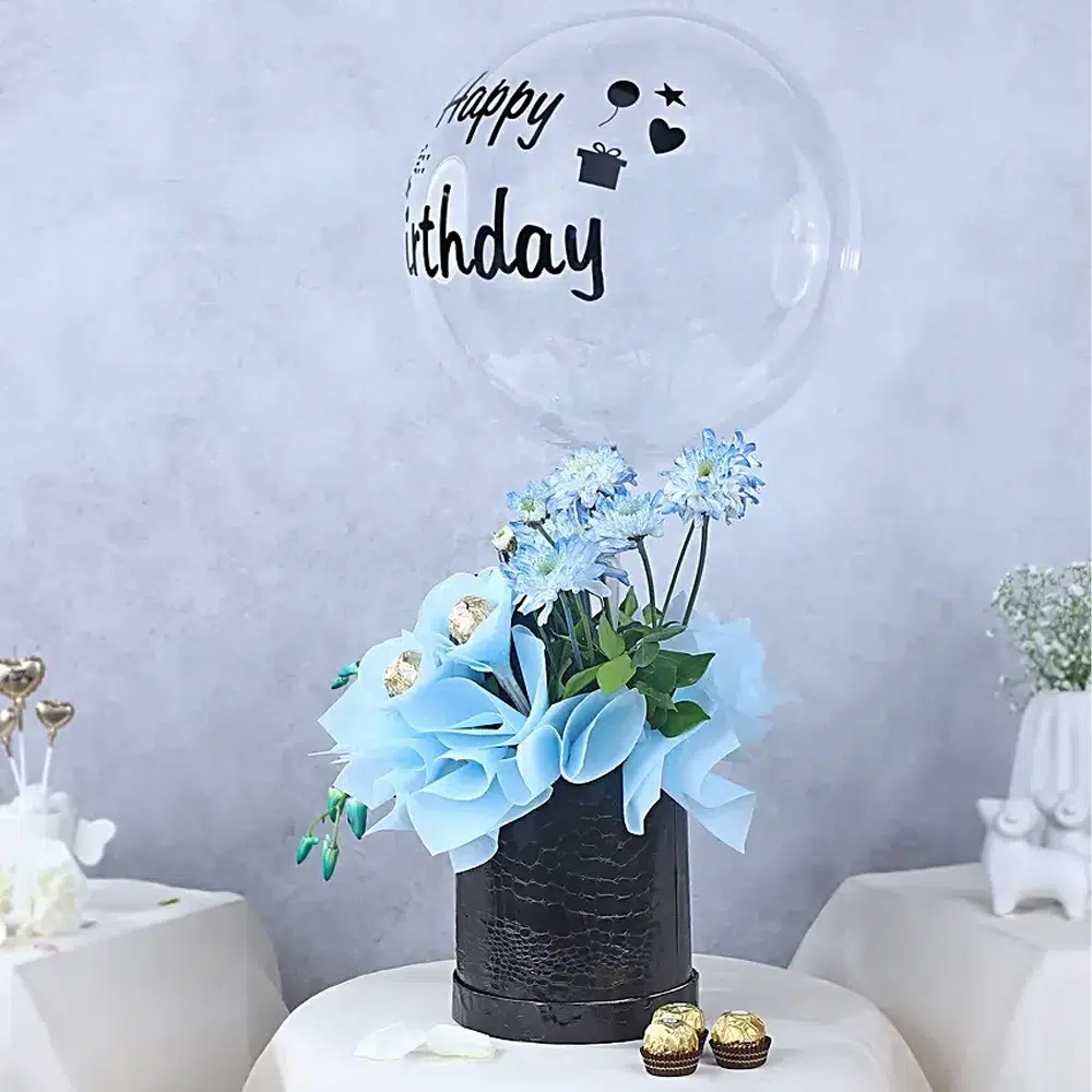 Make birthdays Birthday Balloon Flower Chocolate Combo Same Day Delivery in Burdwan truly unforgettable with this elegant Luxury Birthday Balloon with Flower & Chocolate Combo, designed to impress at first sight. This premium gift arrangement combines modern style, sweetness, and celebration in one beautifully curated box. The transparent balloon printed with “Happy Birthday” instantly sets a festive mood and adds a classy touch to the setup.