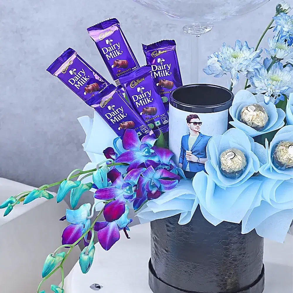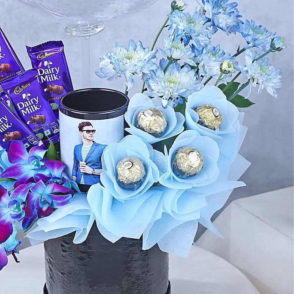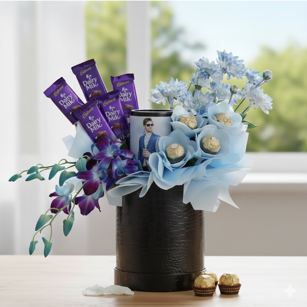 The arrangement features artificial blue flowers crafted with fine detailing, giving a rich and long-lasting appearance. Decorative fillers and elegant color coordination enhance the overall presentation. A selection of delicious Dairy Milk chocolates adds sweetness and indulgence, making the gift both visually stunning and enjoyable. Premium Ferrero Rocher chocolates complete the combo with a touch of luxury and taste.