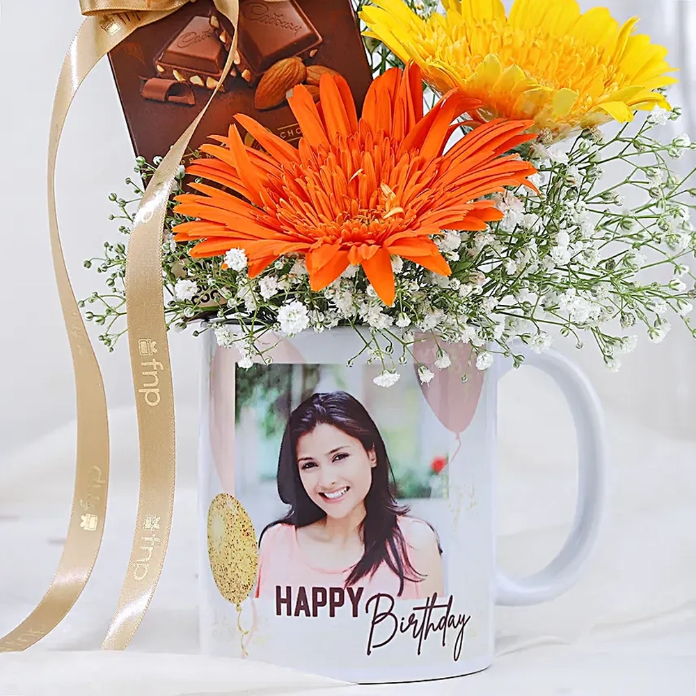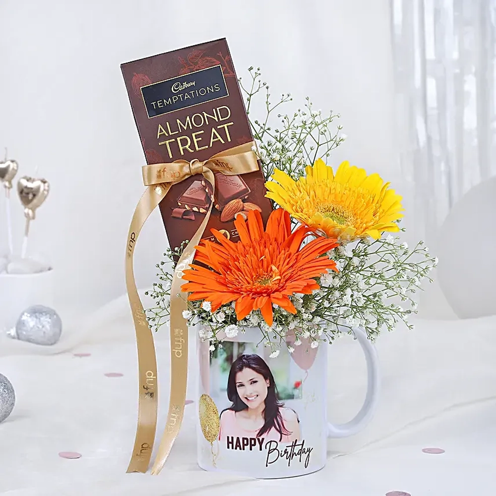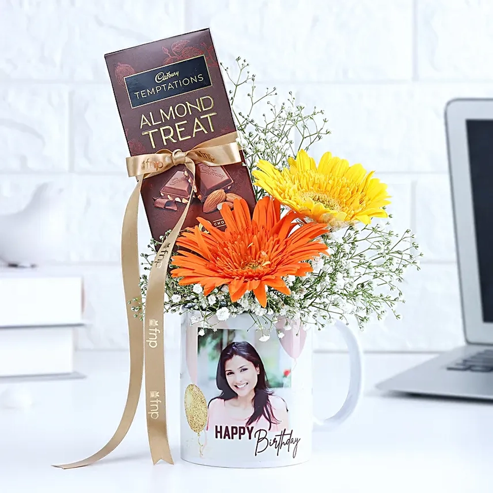 Personalized Photo Mug with Gerbera Flowers & Cadbury Temptations| Same Day Delivery in Burdwan