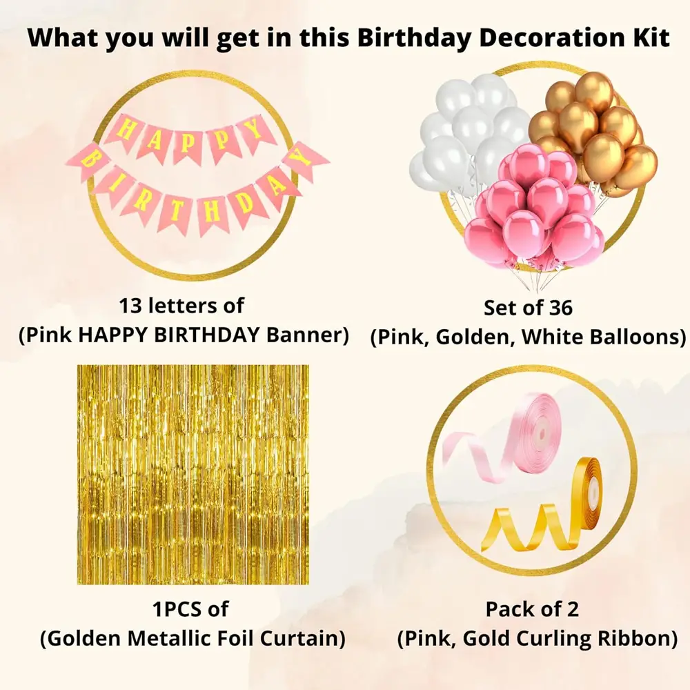 Premium Birthday Decoration Combo – Pink, Gold & White Balloon Set with Happy Birthday Banner