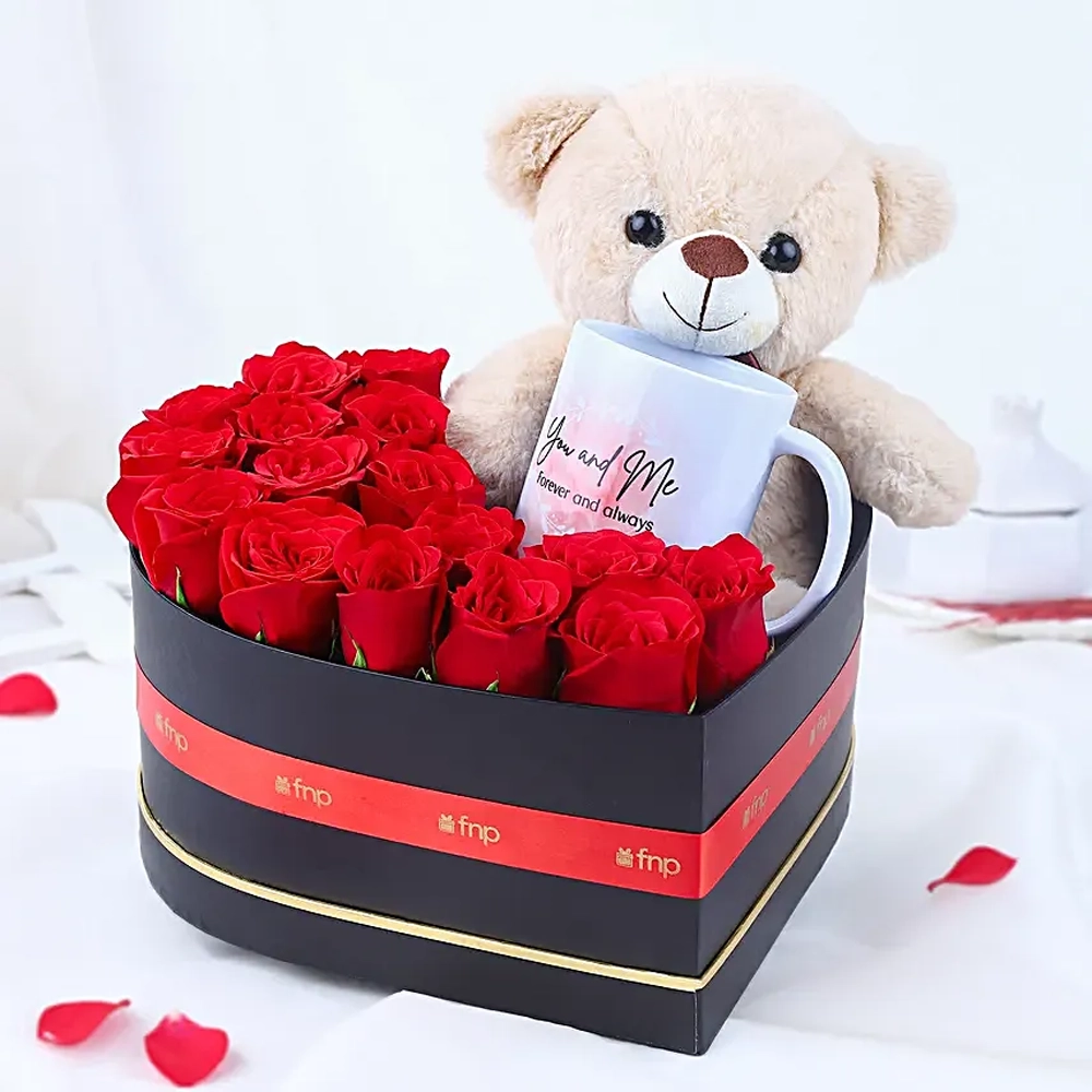 Teddy Bear with Red Roses & Personalized Mug Gift Box| Same Day Delivery in Burdwan