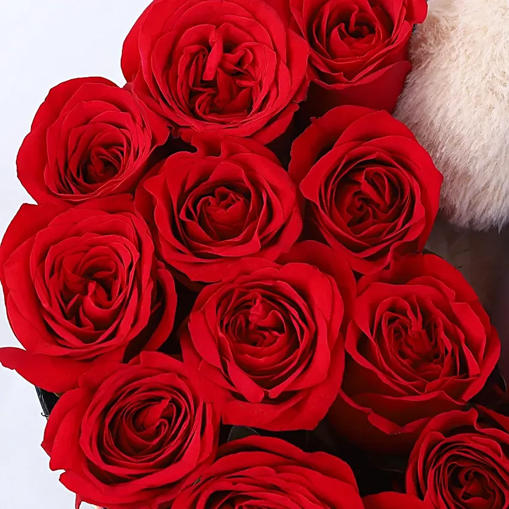 A soft and cuddly teddy bear sits gracefully inside the box, adding a touch of comfort and charm. The plush teddy represents care, warmth, and emotional connection, making this gift ideal for romantic occasions and heartfelt moments.
